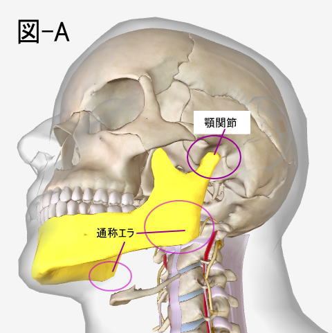 小顔矯正で「エラが張っている」「エラ矯正をする」という、「顔のエラの部分」は下顎骨(かがくこつ=黄色く示した骨)の左右両端部分です。