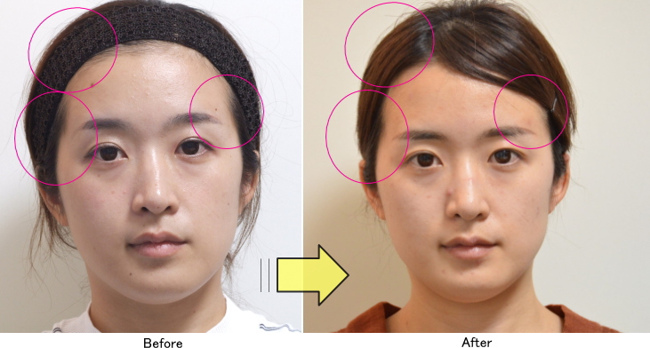 Beforeの写真は目の横から上に頭が広がっていますが、Afterでは頭の広がりが目立たなくなって見えます。