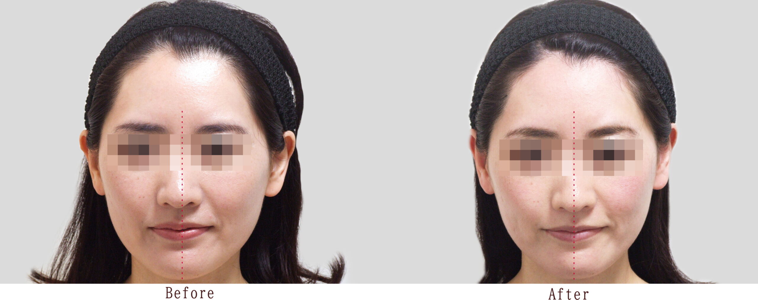 こちらはシンメトリー施術画像ですが、頬骨を含めた輪郭も滑らかに仕上がり、額から鼻、顎にかけて中心が取れています。顔の向きを変えて撮影しているのではない証拠に、向かって左の耳の形状はBeforeもAfterも同じように写真に映っていますが、向かって右の耳は、BeforeとAfterでは見え方が揃っています。また額の光の当たり方が角が取れて滑らかになっていることからも合成写真ではなく骨格的な滑らかさに変化が表れていることが見て取れるかと思います。