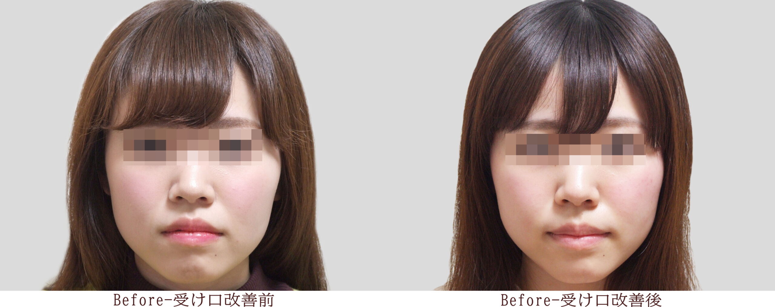 受け口矯正施術の施術前後画像ですが、頭部の光がBeforeは四角く光っているのに対し、Afterは丸い天使の輪となっていて、頬骨から顎にかけての輪郭も滑らかになっています。(写真撮影の位置、カメラ、レンズ、光線などは同じ)