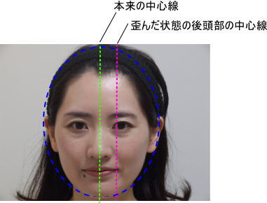 この図と写真で分かるように、顔の左右の非対称は頭蓋骨全体の歪み(中心線のズレ)から起こるもので、小顔矯正によって顔の中心線が整えられれば、このように、ほぼ左右がシンメトリーにお顔になります。